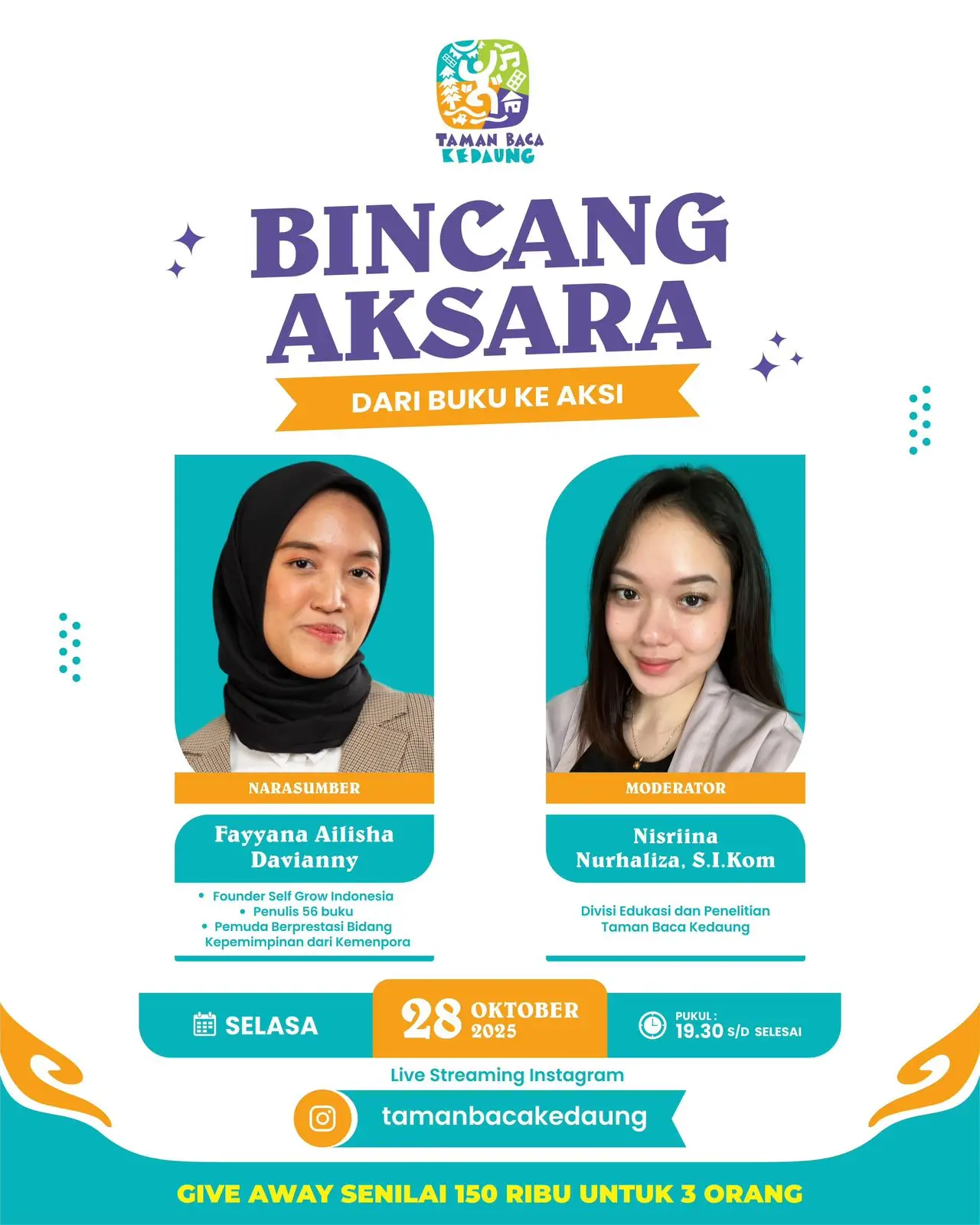Depok (30/10/2025) – Semangat literasi kembali berkobar di Taman Baca Kedaung lewat kegiatan bertajuk “Bincang Aksara: Dari Buku ke Aksi”, yang digelar pada Selasa (28/10/25). Acara ini disiarkan langsung melalui akun Instagram @tamanbacakedaung pukul 19.30 WIB, menghadirkan sosok inspiratif Fayyana Ailisha Davianny — penulis muda produktif sekaligus Founder @selfgrow.id, yang juga dikenal sebagai Pemuda Berprestasi Bidang Kepemimpinan dari Kementerian Pemuda dan Olahraga RI.