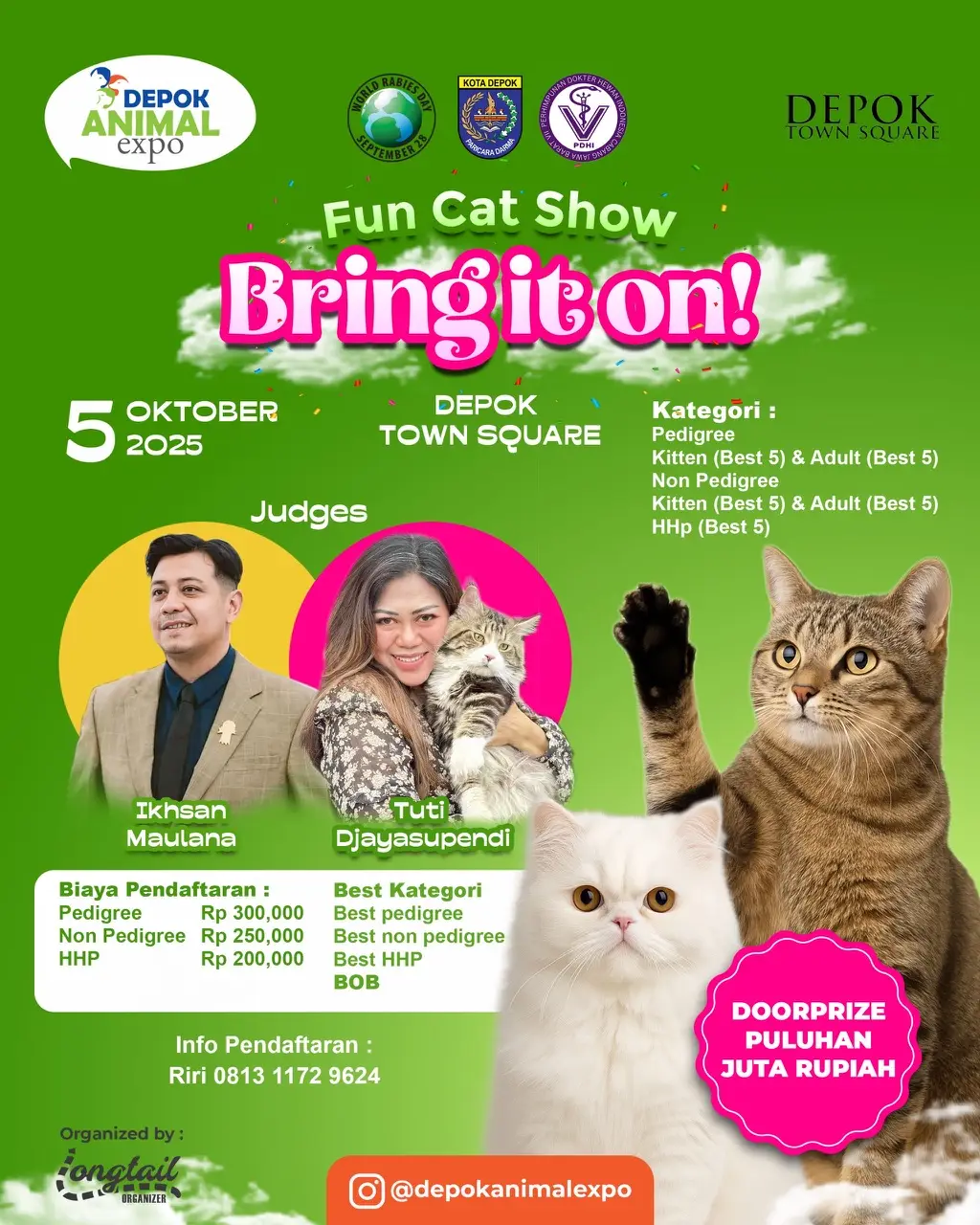 Kemeriahan expo akan ditutup dengan Fun Cat Show “Bring It On!” pada 5 Oktober 2025. Ajang ini menghadirkan dua juri profesional, Ikhsan Maulana dan Tuti Djayasupendi, yang akan menilai berbagai kategori: pedigree kitten & adult, non-pedigree kitten & adult, hingga Household Pet (HHP).